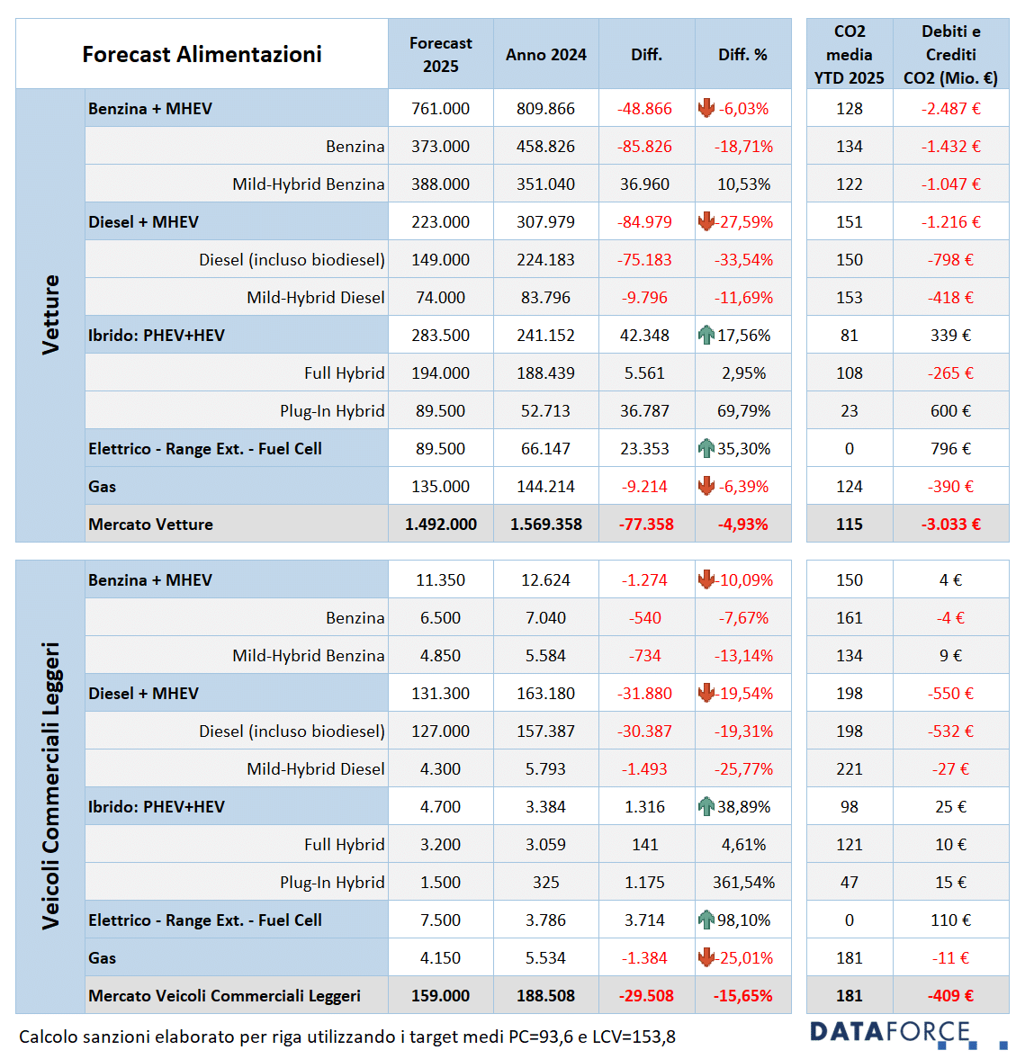Riguardo ai debiti CO2 maturati sulla base delle effettive immatricolazioni per canale, per tipologia di alimentazione e per marca, gli OEM del mercato Italia (Passenger Cars) hanno già accumulato, giunti ormai ai tre quarti dell’anno 2025, sanzioni nei confronti dell’UE per quasi 2,4 miliardi di euro, mentre il livello medio delle emissioni di CO2 scende a 115 g/km, a fronte di un ancora lontanissimo target medio di 93,6 g/km. Il mercato dei veicoli commerciali leggeri, invece, ha già maturato 344 milioni di euro di sanzioni da gennaio a settembre, con un livello medio di emissioni di 181 g/km, pari a quasi 30 grammi in più rispetto al target che per quest’anno è di 153,9.