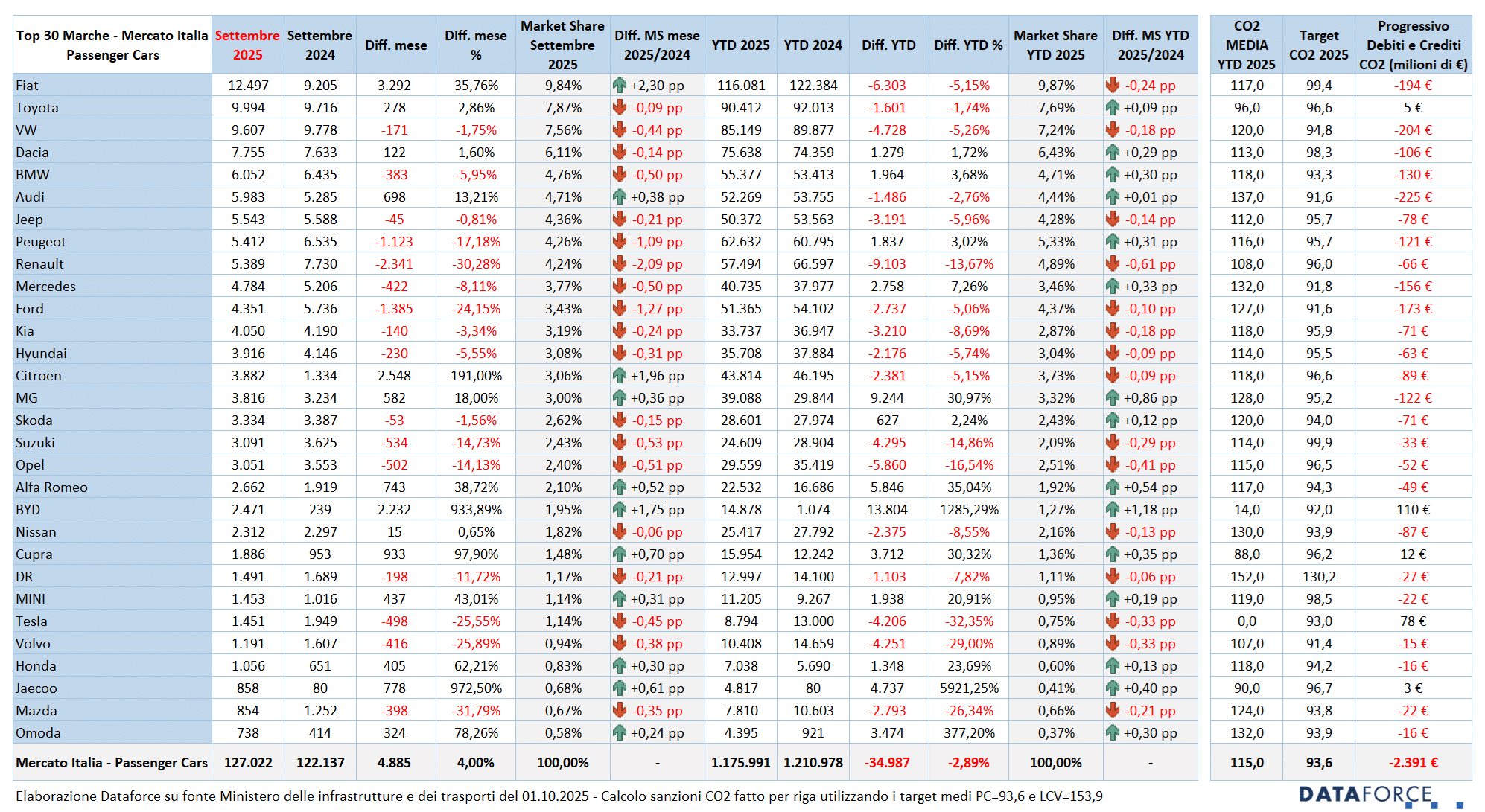 A livello di multe per le emissioni di CO2, Fiat, che ha un obiettivo di 99,4 g/km, ha raggiunto una media nelle vendite dei primi 9 mesi di 117 g/km, e dunque ha accumulato 194 milioni di sanzioni teoriche. Addirittura superiori le sanzioni che dovrebbe pagare Volkswagen (204 milioni di euro, avendo un obiettivo di 94,8 g/km ma avendo raggiunto da gennaio a settembre 120 g/km). Ancora più difficile il caso di Audi, che ha un obiettivo di 91,6 g/km ma raggiunge i 137 g/km come risultato effettivo e quindi rimane davanti a Volkswagen nella classifica delle multe teoriche più elevate: ben 225 milioni di euro. Ben più virtuosa Toyota che, con un obiettivo di 96,6 g/km, si è attestata a 96 g/km ed è quindi in credito di 5 milioni. Fra quelli bravi che accumulano crediti, una menzione va fatta a BYD: con 15.000 auto targate da gennaio a settembre ha maturato un attivo di crediti di 110 milioni di euro. Pur avendo un target di 92 g/km, attualmente si attesta a 14.