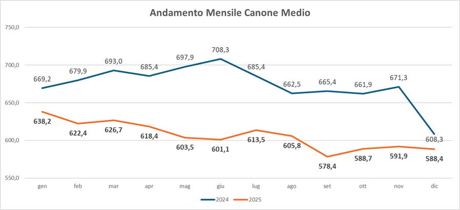 Da dicembre 2025 i Canoni Medi si sono stabilizzati intorno al valore di 580€, un valore pressoché identico a quello di dicembre 2024. Se si confronta l’andamento da gennaio 2024 a dicembre 2025, Il Canone Medio risulta diminuito del 8.49%, passando da 634,37€ (gennaio 2024) a 580,48€ (dicembre 2025).