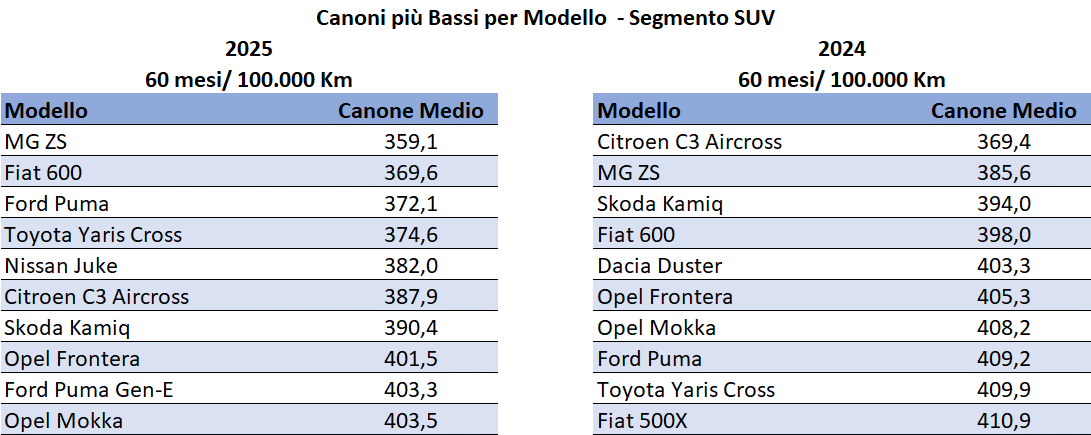 Nel 2025 per la combinazione durata/chilometraggio 60 mesi/100.000 km, i modelli Kia Picanto (278,02 €), Hyundai I10 (285,55€) e Fiat Pandina (289,50€) sono risultati i più economici. La Kia Picanto è stata introdotta in questo combinazione di offerta proprio nel 2025. La Panda, pur mantenendo quasi invariato il Canone Medio dal 2024, è passata al quarto posto della classifica, superata nella parte finale dell’anno dalla quasi identica Pandina.