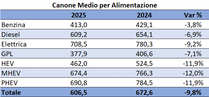 Tutte le tipologie di alimentazione hanno registrato un decremento del Canone Medio. Le alimentazioni HEV, MHEV e PHEV sono quelle che hanno subito una riduzione più evidente, di circa il 12%. A seguire, con circa -3 punti di distanza, le vetture con motorizzazione Elettrica. Il Canone Medio delle vetture alimentate a GPL è sceso del 7,1%. I modelli alimentati a Benzina e Diesel hanno fatto segnare un decremento più contenuto (rispettivamente del 3,8% e 6,9%).