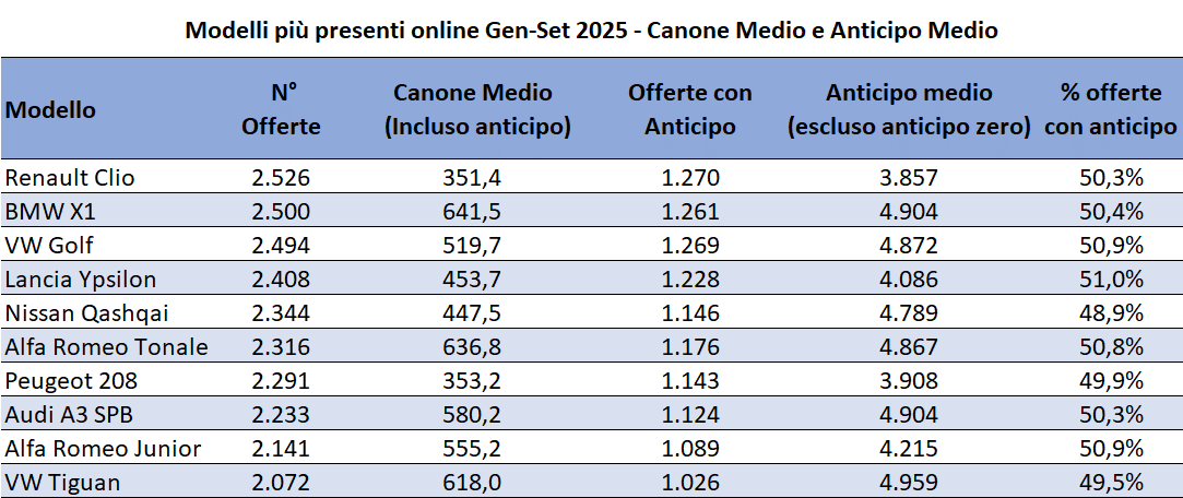 Nel 2025 le vetture che hanno occupato i primi tre posti della classifica dei modelli maggiormente presenti online sono state: Renault Clio (351,39€), BMW X1 (641,52€) e Volkswagen Golf (519,65€). Per questi tre modelli l’anticipo medio, quando richiesto, è pari nell’ordine a 3.857 €, 4.904 € e 4.872 €.