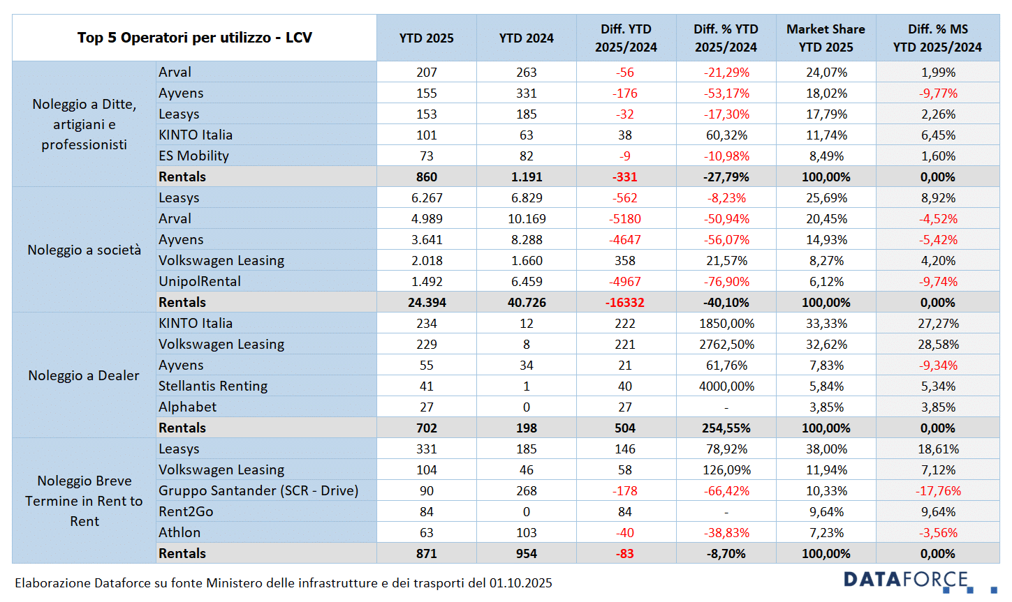 In ambito LCV, i volumi destinati ai “privati” (cioè le ditte individuali, gli artigiani e i professionisti), ai dealer e al rent-to-rent sono scarsamente significativi: in questo ambito sono i noleggi alle società a costituire la parte più rilevante del mercato. L’operatore che comanda questa Top 5 è Leasys (fino al trimestre precedente era Arval), seguito da Arval, Ayvens, Volkswagen Leasing e UnipolRental.