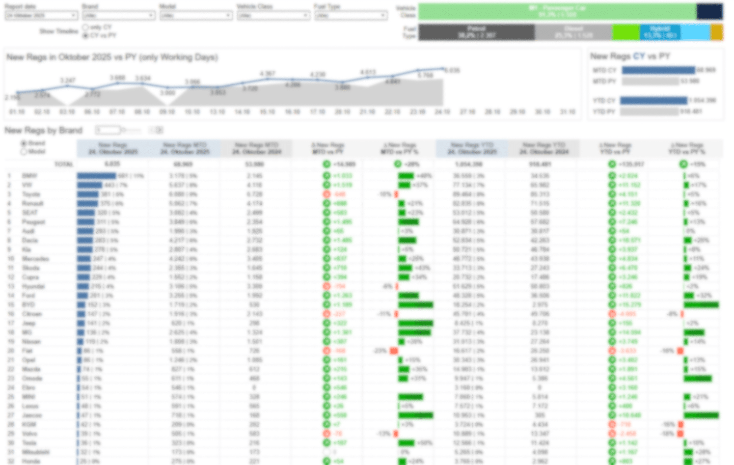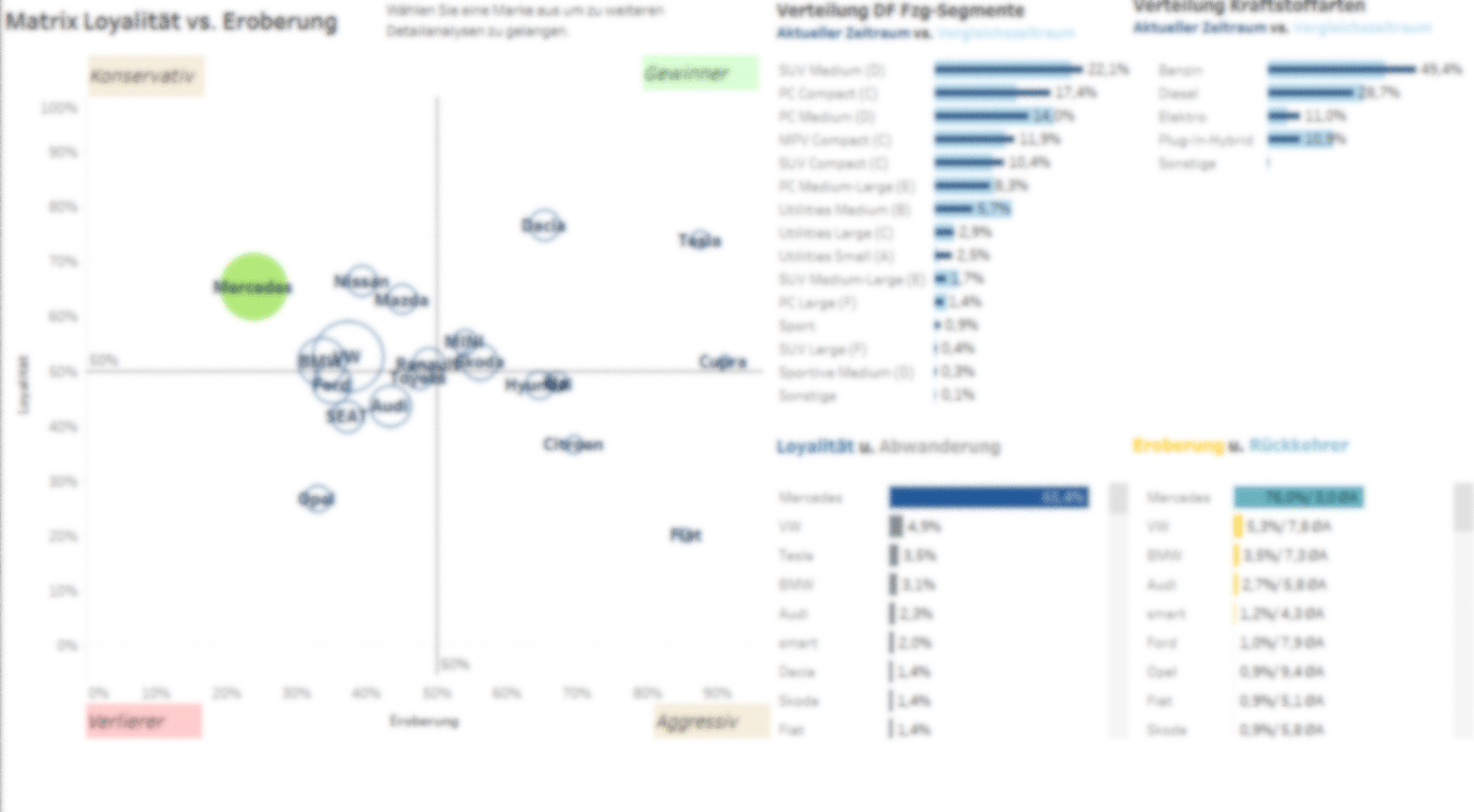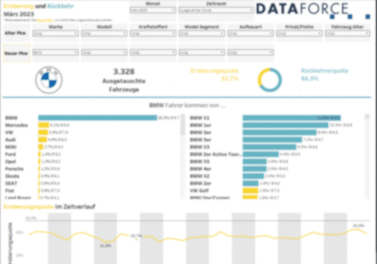 Die verschiedenen Datenströme von Dataforce bieten größtmögliche Flexibilität bei der Auswertung, da alle Auswertungsdimensionen (Marke, Modell, Bodystyle, Krafstoffart, Gewicht, etc.) in jeglicher Weise miteinander kombiniert werden können. Von einem Gesamtüberblick über den Markt über die Darstellung Ihrer individuellen KPIs bis zur Analyse regionaler Unterschiede – Dataforce ist Ihr kompetenter und verlässlicher Partner.